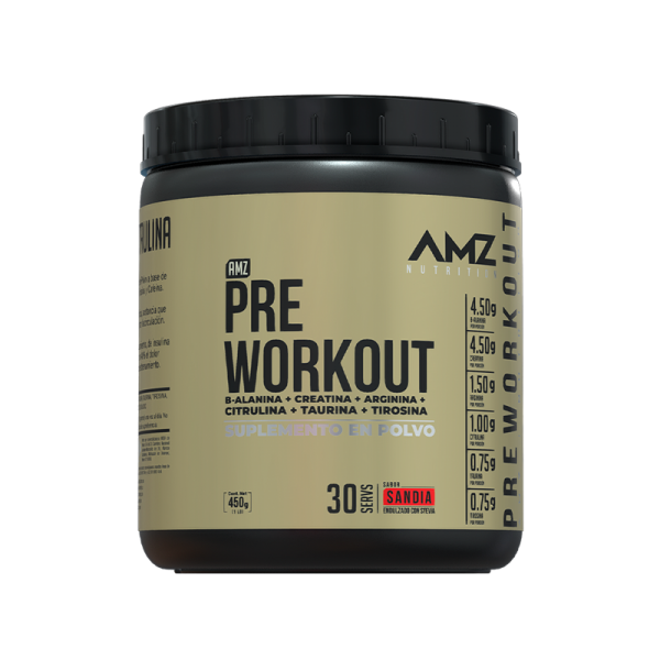 AMZ PRE WORKOUT Es un suplemento alimenticio en polvo a base de B-Alanina, Creatina, L-Arginina, Citrulina, Taurina, Tirosina y Cafeina. La L-arginina es un precursor biológico  e óxido nítrico,  sustancia que hace que los vasos sanguíneos se dilaten para  mejorar la circulación.